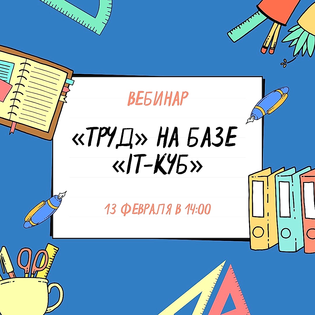 13 февраля в 14:00центр цифрового образования детей «IT-куб» г. Снежинска проведет вебинар «Возможности реализации программы «Труд» на базе «IT-куб». К участию приглашаются руководители, их заместители, педагоги и методисты образовательных организаций.