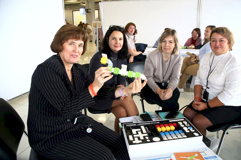 «Я убеждена, что лучшее знакомство с проектом - это практика. Поэтому презентовав наши пособия, я разделила участников на подгруппы по 3-4 человека, каждой из которой было предложено выполнить то или иное задание, представленное на страницах нашей трилогии книг. Педагоги смогли почувствовать себя детьми и на собственном опыте оценить удобство и эффективность нашей авторской методики. Участники выполняли задания на развитие логики и алгоритмики, конструируя модели по схемам. Сложность задания в том, что схемы передают плоскостное изображение, и педагогам было необходимо, используя справочный материал Пин Ап собрать объемную конструкцию».